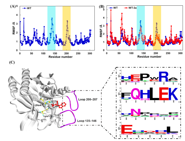 图一. 基于晶体结构的分子动力学模拟及氨甲酰水解酶的氨基酸序列进化保守性分析