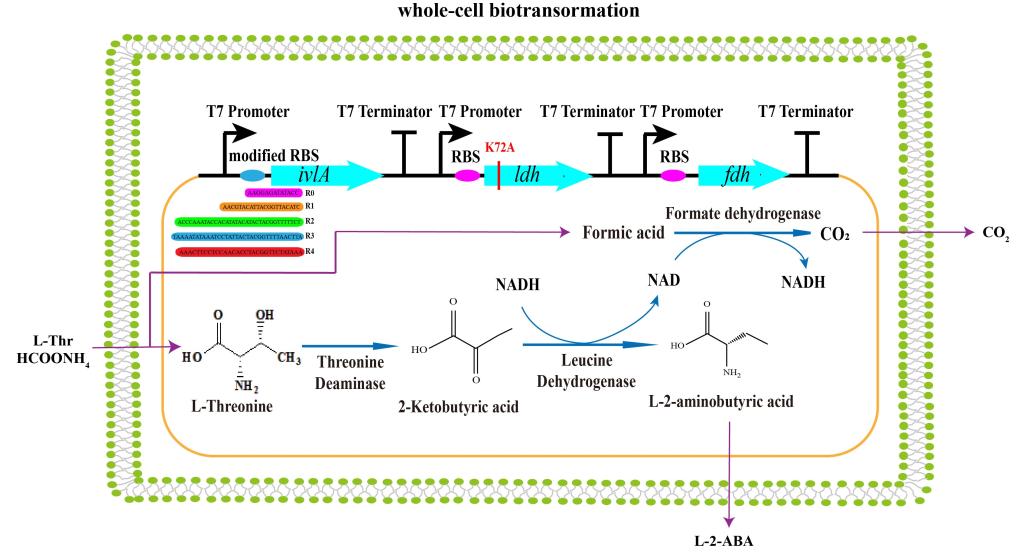 L-2-氨基丁酸(L-2-ABA)是非天然手性氨基酸,广泛用作生产手性药物的前体,以及用于抑制人类神经信息的传递并促进脑细胞的代谢。传统的化学制备方法存在成本高、污染严重、光学纯度低等缺点;常见的生物酶法制备L-2-氨基丁酸为“一锅法”,该方法需要单独发酵培养两种以上菌株、严格控制三种酶(苏氨酸脱氨酶、亮氨酸脱氢酶、甲酸脱氢酶)的添加量,增加了生产成本和工艺要求。因此,需要构建多酶级联催化的单细胞来实现同一宿主的多酶共表达。