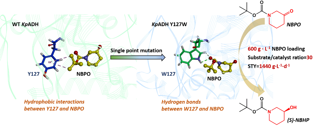 倪晔教授团队通过对来自多孢克鲁维酵母Kluyveromyces polyspora的重组醇脱氢酶KpADH进行改造,获得了不对称催化N-Boc-3-哌啶酮(NBPO)还原生成(S)-NBHP的高效突变酶。首先,基于KpADH的晶体结构和分子对接,构建了底物结合位点的饱和突变文库并进行高通量筛选,发现127位点的突变可实现催化效率和立体选择性的共进化;通过对127位点所有单点突变进行表观动力学参数测定,反应进程和稳定性研究,确定了最优突变体Y127W;在不添加外源辅因子的条件下,引入葡萄糖脱氢酶进行辅酶循环,Y127W可在10小时内实现600 g/L底物的完全转化,计算时空产率为1440 g/(L·d),为目前酶法不对称还原合成(S)-NBHP的最高报道水平;通过对Y127W进行蛋白晶体结构解析和分子动力学模拟,发现突变后127位点色氨酸残基与底物Boc基团形成的额外氢键是其具有优异的催化活力和严格立体选择性的主要原因。该研究不仅为制备手性杂环醇类化合物提供了高效的生物催化剂,而且通过合理的计算机模拟加深了研究者对醇脱氢酶催化活力和立体选择性共进化机制的理解,为蛋白质工程用于新酶的理性设计提供了理论基础。