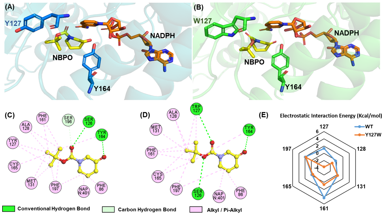 图一. 醇脱氢酶KpADH及其突变体Y127W与底物NBPO的分子对接及作用力分析