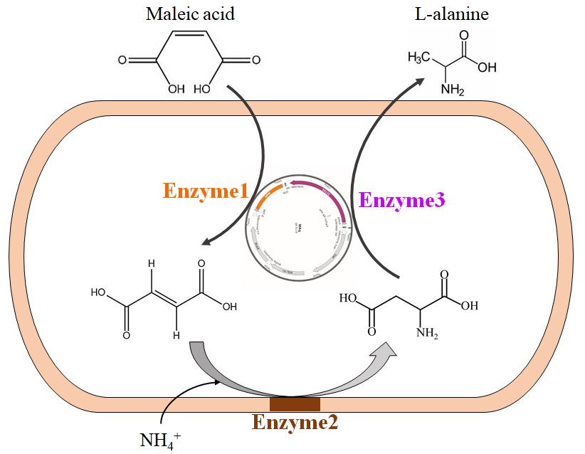 本研究基于多酶系统构建,探索了一种具有良好应用前景的低成本、高效率的L-丙氨酸工业化生产工艺。本工艺以马来酸酐为原料,分别在马来酸异构酶、天冬氨酸酶和天冬氨酸脱羧酶的催化下,转化为L-丙氨酸。通过对关键酶的筛选、重组酶的表达优化以及宿主细胞的基因修饰,获得了由宿主细胞基因组酶和两种重组酶组成的三酶系统,既降低了细胞的生长压力,又实现了重组酶的高效表达。同时,开发了L-丙氨酸转化的循环工艺:三酶系统催化合成的高浓度L-丙氨酸,用马来酸滴定法沉淀L-丙氨酸,沉降后的上清溶液循环用于下一批全细胞催化,大大降低了污水排放。