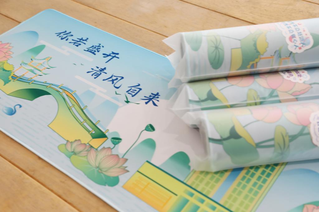 鼠标垫以简笔漫画形式绘以图书馆、曲水桥、黑天鹅、小蠡湖、莲花莲蓬等特色元素,书写“你若盛开清风自来”主题字样,并印有学院名称和毕业生党员姓名,封装袋上贴有“不负韶华未来可期”“愿你全力以赴且满载而归”等各色祝福语,引导党员每次移动鼠标都提醒自我遵守党规党纪,清风常伴,坚守初心。