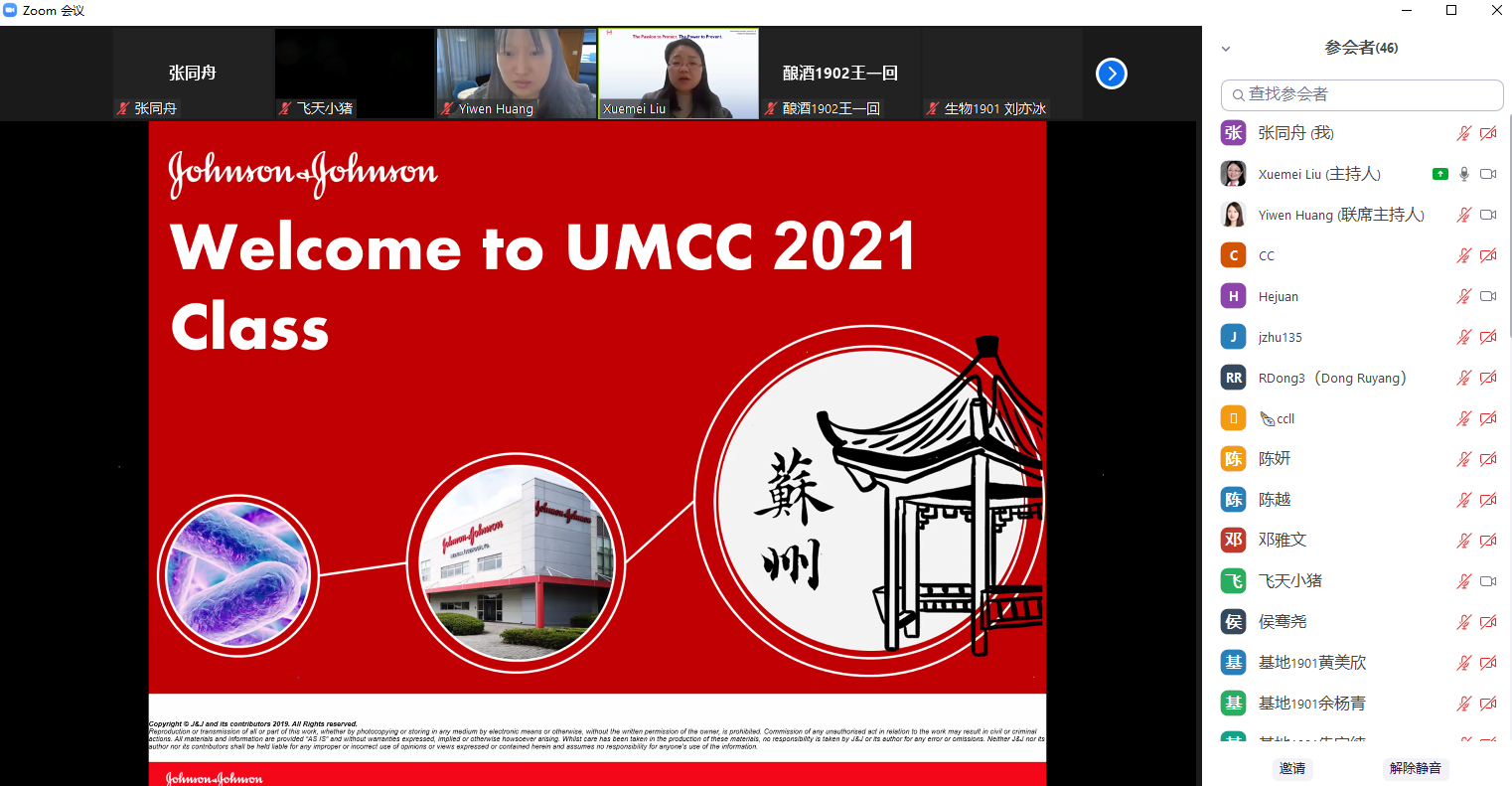 11月27日下午,世界杯官网与强生(苏州)医疗器材有限公司2021年度校企合作课程(医疗器械和制药微生物学UMCC模块)开班并进行第一次授课。强生(苏州)公司微生物质量及无菌保证(MQSA)总监刘雪美、MQSA高级研究员黄奕雯、MQSA经理朱健杰、MQSA研究员董薷阳,世界杯官网辅导员张同舟等参加活动。因疫情防控需要,本次课程通过ZOOM平台线上举行。