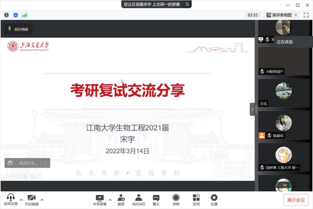 为加强对考研学生的复试和调剂指导,3月14日晚7点半,世界杯官网以网络会议的形式,组织开展2022届考研复试调剂“云”分享活动。辅导员陆燊佳、侯景瑞、王珏参加活动,邀请世界杯官网研究生任涛,世界杯官网校友、上海交通大学生物医学工程专业研究生宋宇,世界杯官网校友、上海大学化学专业研究生周梓博作为分享嘉宾,2018级正在准备考研复试的同学以及部分2019级同学参加本次分享会。