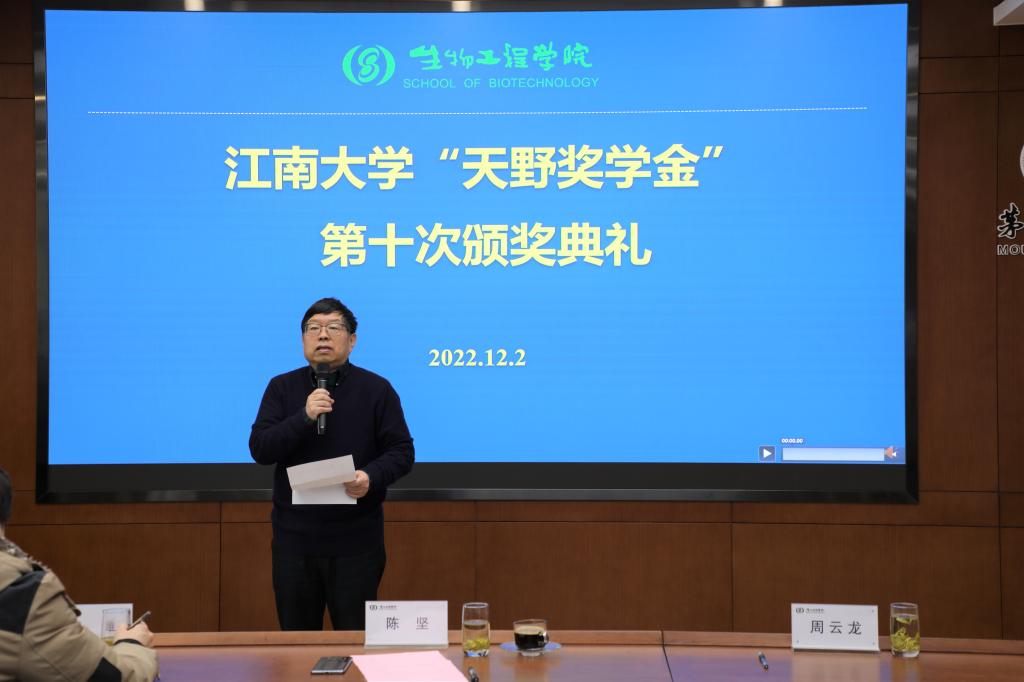 陈坚院士在致辞中对天野酶制品株式会社长期以来的支持表示感谢,尤其对天野公司在疫情背景下坚持向我校学生颁发奖学金并加大支持力度表示感动。他还向天野先生介绍了张启先校友生前任职的上海凯赛生物在学校设立“张启先奖励基金”和“张启先奖学金”的相关情况。他最后勉励同学们要更加致力于科技创新,学习天野公司“从无创造有”的精神,不断增长才干,成为行业中坚,努力为中日友好、社会进步和人类文明作出贡献。