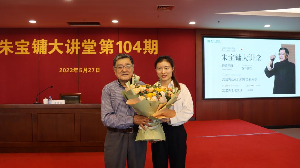 报告会上,高景炎首先回忆了在无锡轻工学院的学习往事,回顾了朱宝镛先生等众多发酵前辈甘于奉献、求真务实、顽强拼搏等优良品质。同时还分享了自己从业六十一年来的峥嵘岁月,内容丰富、语重心长,带领广大师生深刻领会了解放思想、团结奋进和科技进步的重要性,希望同学们做到刻苦钻研,不怕困难,勤于实践,为母校增光,为国家添彩。讲座结束后,同学们还同高老进行了提问交流,并为高老送上献花。
