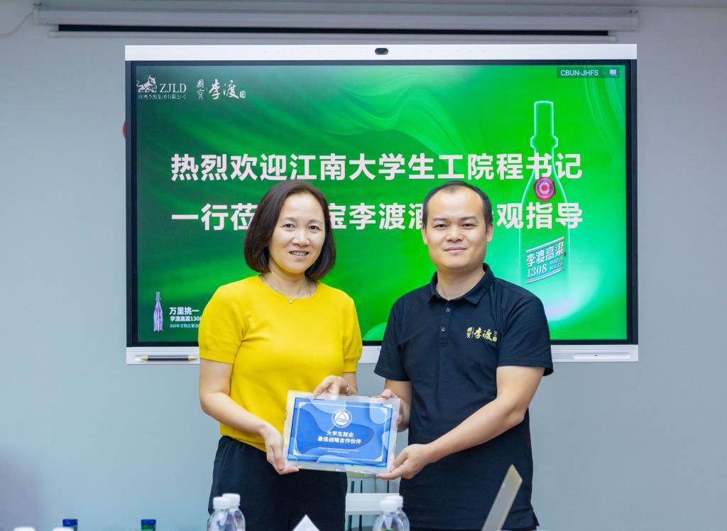 座谈环节,李渡酒业人力资源总监兼销售公司副总经理汤华平、酿酒公司常务副总经理朱栋才、酿酒公司助理总经理兼科研技术中心主任杨涛等公司领导与程捷音一行进行交流。朱栋才详细介绍了李渡酒业的历史、文化和发展经营情况。程捷音介绍了世界杯官网近年来在人才培养、科学研究、师资队伍建设等方面取得的成绩。双方领导就科技合作、人才培养、学生就业等开展深入讨论。