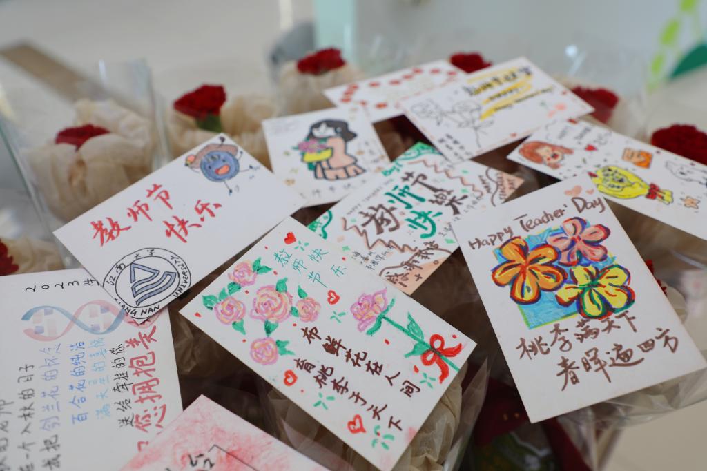 落其实者思其树,饮其流者怀其源。活动现场被心形康乃馨花装点,与展板上同学们亲手制作的手绘贺卡所组成的心形造型遥相辉映。志愿者双手递上一束花,热情喊一句“老师祝您节日快乐”,真诚的谢意洋溢在师生之间。在留言板上,同学们留下了对老师们的深切告白:“三尺讲台栽桃李满园,挥洒青春育四海才子”“‘师’与远方感念在心”……对老师的感激之情流淌在字里行间。贺卡盲盒抽取活动,是今年教师节的一大亮点。老师们从信封里随机选择一张贺卡,背面是同学们亲手绘制的祝福贺卡,温暖的色彩、朴实的话语,映入眼帘,暖在心头。不仅在主活动区有温情,在教学楼、实验室、军训场也是感动一波又一波。课前给老师的惊喜祝福、军训间隙的真挚献唱,生工学子“花式告白”敬爱的老师。心存感恩,致敬每一位提灯引路的教育追梦人。
