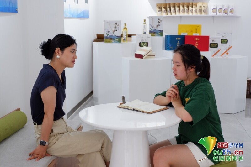 图为团队成员采访农产品展示馆馆长。中国青年网通讯员 苏鑫 摄