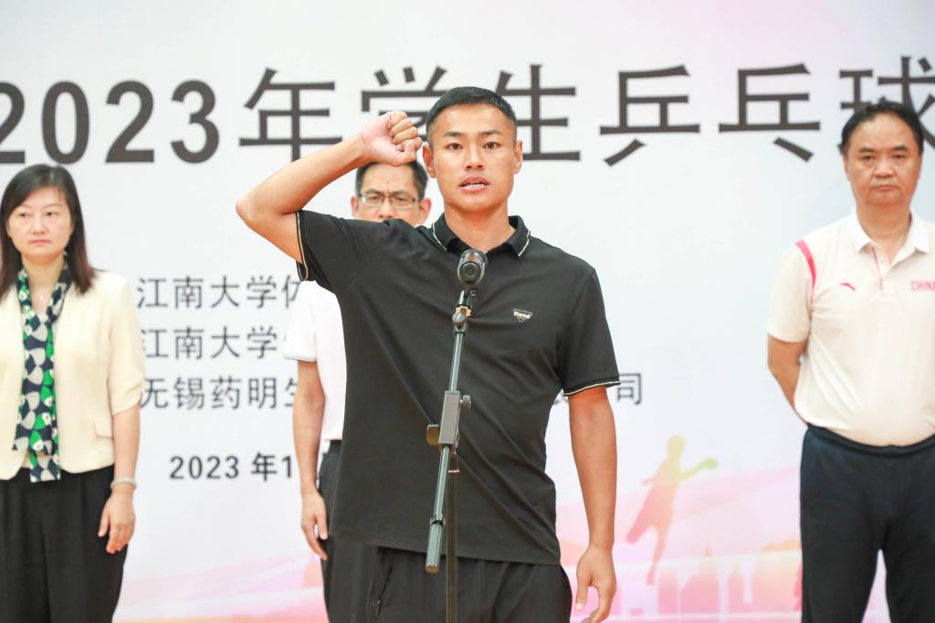 林丹在开幕式致辞中鼓励同学们积极参加体育运动,锻炼强健体魄与坚定意志,并祝愿全体运动员在本次乒乓球赛中赛出水平、赛出风度。随后运动员代表江晖、裁判员代表陈聪聪老师依次宣誓,表示将严格遵守比赛规则,秉承体育精神。接着,周建中宣布比赛正式开始。