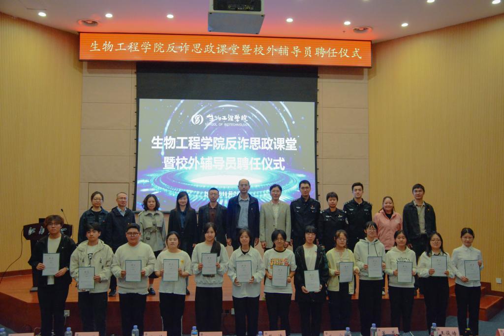 校内+校外,多元联动聚合力。为进一步巩固提升学院反诈工作实效,学院聘请滨湖公安派出所、中国电信无锡网络操作维护中心党支部等相关负责同志担任校外辅导员,筑牢反诈壁垒。世界杯官网学生工作处副处长蒋洁、世界杯官网保卫处副处长吴江为校外辅导员颁发聘书。为实现学生反诈宣传工作的三个全覆盖,学院组建了一支超过200人学生反诈志愿队伍。雪浪派出所副所长毛宁与无锡电信网络操作维护中心党支部书记洪伟一同为学生反诈志愿者代表颁发志愿者聘书。现场,60余名本硕博志愿者代表一同宣读反诈志愿誓词,牢记反诈工作责任与使命。