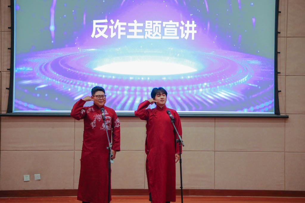 趣味+互动,多样宣传促实效。活动现场,学生反诈志愿者代表通过大学生喜闻乐见的形式进行现场反诈宣讲。王晨、王泽霖同学以幽默风趣的语言带来相声《一“本”正经的反诈手册》,重点宣传刷单诈骗、冒充公检法诈骗和杀猪盘诈骗案例与防范手段;杨博宁同学以《远离诈骗,做幸福的大学生》盘点了学生群体中常见的诈骗案例,号召全体学生牢记反诈意识,用马克思主义劳动价值理论武装大脑,管好钱袋子。学生配音小组通过改编配音影视等方式宣讲了缅北电信诈骗案例,警惕陌生电话不要接、陌生链接不要点、陌生短信不轻信。