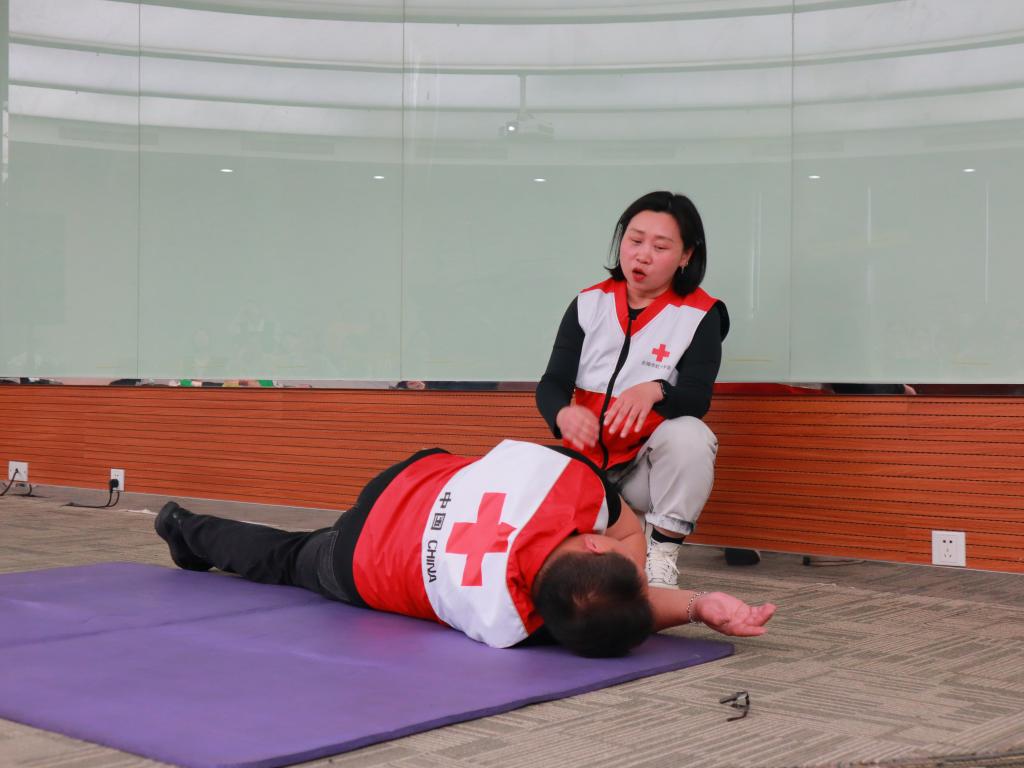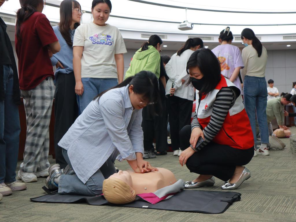 活动过程中,唐镇棣从晕倒、异物梗阻、心肺复苏三个方面进行了急救知识理论讲授与实操演练。首先,针对晕倒突发情况,唐镇棣向现场同学展示了如何正确对患者进行翻身操作并打开其气道。其次,针对气道异物梗阻的突发情况,她进行了腹部冲击法的实际演示并带领现场同学进行练习。最后,唐镇棣还聚焦于心肺复苏方法(CPR),向同学们讲解了如何在有效抢救时间内对呼吸心跳骤停的患者进行应急救护,她借用人体模型介绍了自动体外除颤仪(AED)的使用方法,并与助手进行了实操演练教学。