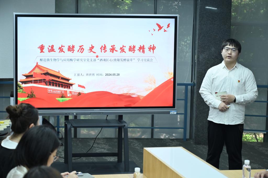 交流会在世界杯官网酒科技馆举办,旨在带领师生沉浸式体悟发酵之光、学科力量。通过回顾第106期朱宝镛大讲堂暨中国酿酒大师访谈会现场,引出“致敬发酵前辈 吾辈勇担使命”的交流话题。党支部成员、2021级博士生班世博以“重温发酵历史 传承发酵精神”为主题展开分享,讲述中引经据典,带领师生重温那段峥嵘岁月,结合科研实际,他提到“发酵工程领域的前辈们引领发酵学科前进,作为行业后辈,当以前辈为榜样,站在巨人的肩膀上发奋图强。”