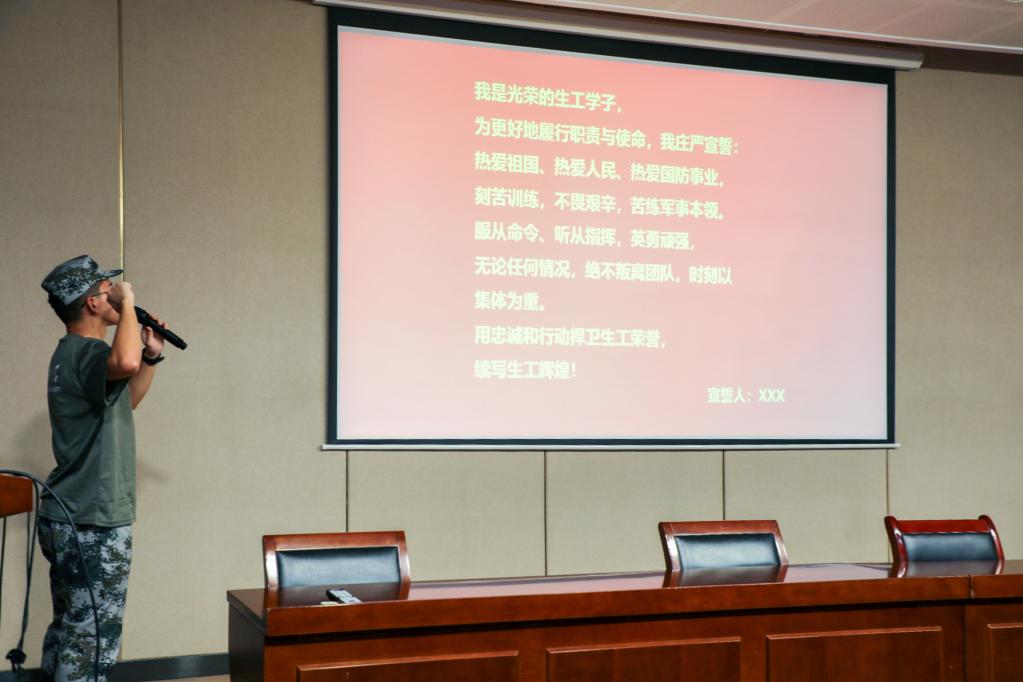 学院2025级本科生代表陈一鑫带领全体参训同学宣誓。在掷地有声的军训誓词里,每一位新生都满含激情、斗志满怀。这份热血与信念已然昭示:生工学子必将以青春为帜,勇接军训的重重挑战;以奋进之态,让热血在训练场尽情绽放。