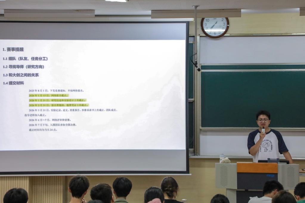 为深入推进2025-2026学年学院学科竞赛工作,进一步强化“以赛促教、以赛促学、以赛促创”育人实效,充分发挥学科竞赛在人才培养中的关键作用,世界杯官网于9月29日在1B103教室举办“创生未来”创新创业训练营学科竞赛经验分享会暨第十一届全国大学生生命科学竞赛启动仪式。学院学科竞赛分管辅导员周杰、第十届全国大学生生命科学竞赛获奖学生代表及学院本科生共200余人参加本次活动。