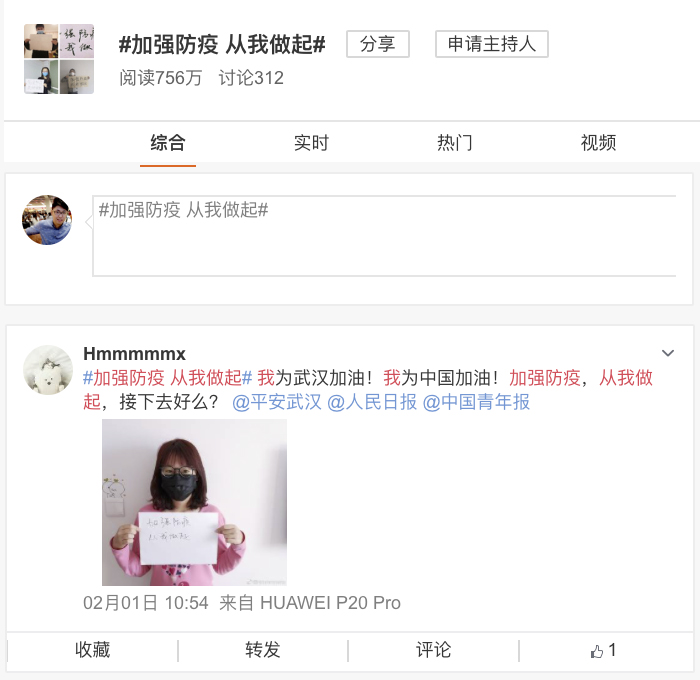 微博上,很多青年网友通过分享照片和标语为武汉加油。来自世界杯官网的徐卓雅同学也在此次活动中分享了一张手持“加强防疫 从我做起”标语的照片,并配文“为武汉加油、为中国加油,加强防疫,从我做起。”徐卓雅说,疫情防控已经进入关键时期,作为一名武汉人,同时也是一名大学生,更应该承担起青年人的使命,不信谣、不传谣,及时向社区、学校汇报相关情况,也希望广大青年学子都可以这么做,积极配合,防控疫情。