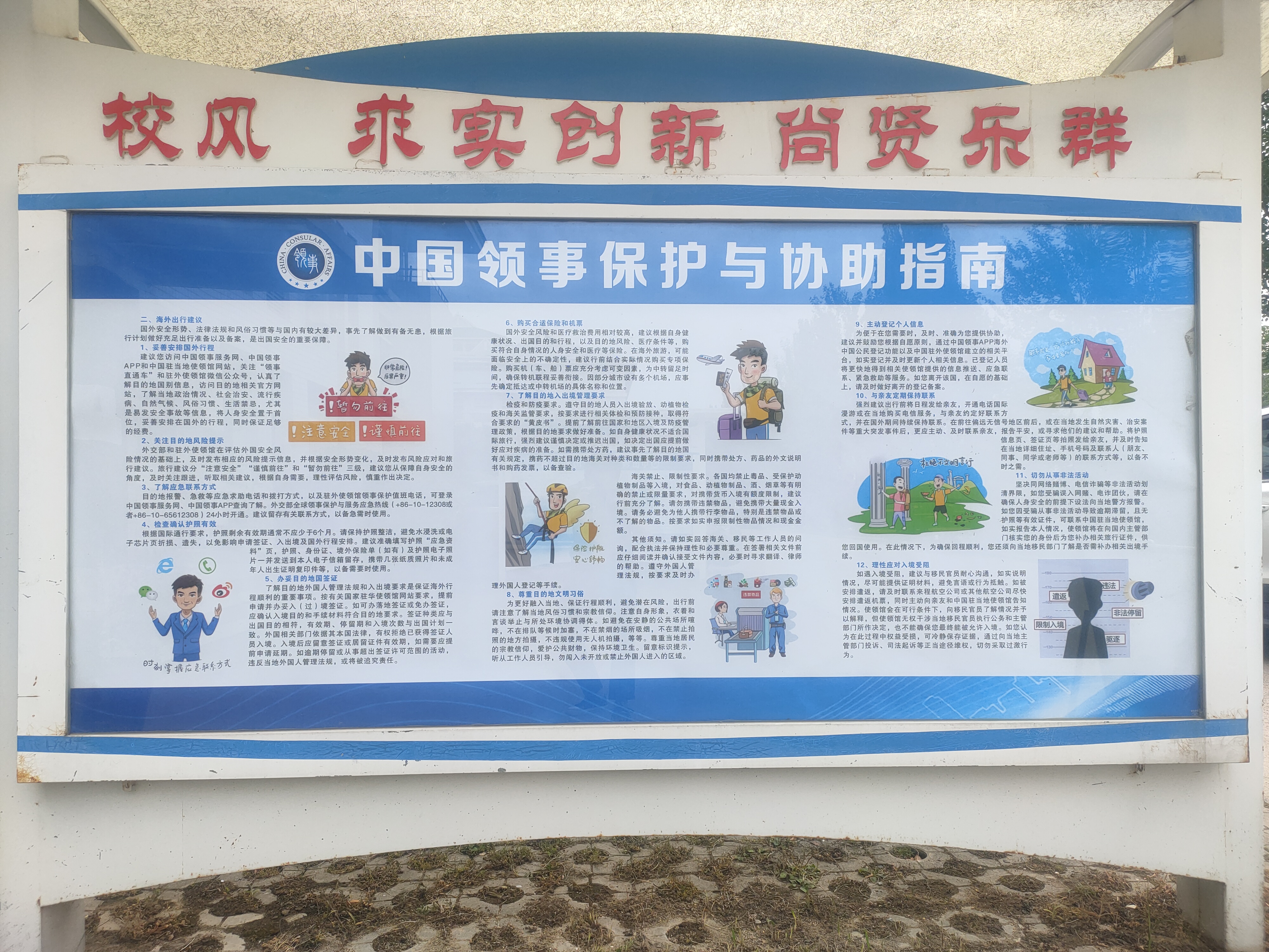国教院和其他二级学院分别通过制作宣传展板、校园网络平台宣传及召开主题团学会议、班会、绘制黑板报等方式,向师生宣传《中国领事保护与协助指南》,组织学生观看了《中国领事保护与协助指南》系列动画宣传视频,多形式向广大师生科普领事保护与协助、国外旅游安全注意事项、海外出行常见风险种类、海外出行建议、海外安全风险自我防范以及遇到紧急情况如何通过领事保护自救系列知识与方法,引导师生提高风险防范意识和应急处置能力,有效应对海外安全风险。(通讯员:孔学志 审稿:罗超)
