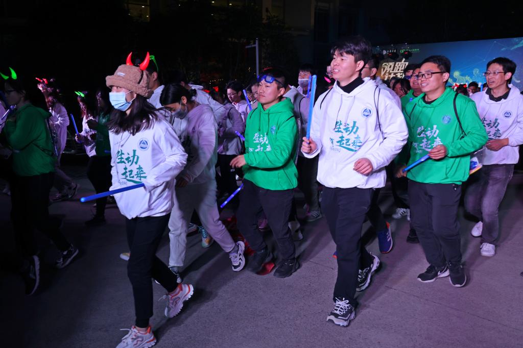 本次荧光夜跑以“生动起来!我就是发光体”为口号,寓意每位师生2022都将闪闪发光。共设置“赤水河站”“金沙江站”“大渡河站”“吴起镇站”四个站点,奔跑的同时加强党史学习教育,师生经过层层站点打卡,涂抹荧光笑脸,跟学青春舞步,手写新年祝福,留念荧光手印,留下片片欢声笑语。