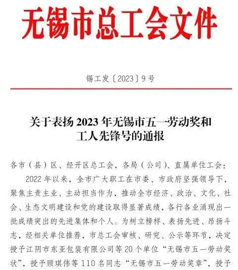近日,无锡市总工会发布《关于表扬2023年无锡市五一劳动奖和工人先锋号的通报》(锡工发〔2023〕9号),对聚焦主责主业、主动担当作为,推动全市经济、政治、文化、社会、生态文明建设和党的建设成绩突出的先进集体和个人予以通报表扬,世界杯官网倪晔教授荣获“五一劳动奖章”荣誉称号。