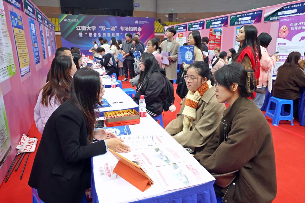 招聘会现场气氛热烈,毕业生向用人单位积极投递简历,就公司概况、薪资水平、发展前景等进行详细了解。部分企业还进行了现场面试,和学生初步达成签约意向。