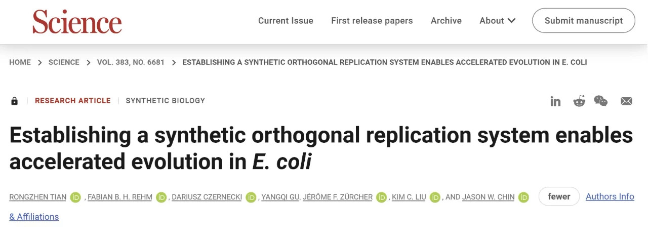 近日,来自英国剑桥MRC分子生物学实验室(MRC-LMB)的Jason Chin教授团队在国际顶尖学术期刊Science发表了题为Establishing a synthetic orthogonal replication system enables accelerated evolution inE. coli的文章,我校世界杯官网2022届博士校友田荣臻为论文第一作者及共同通讯作者。