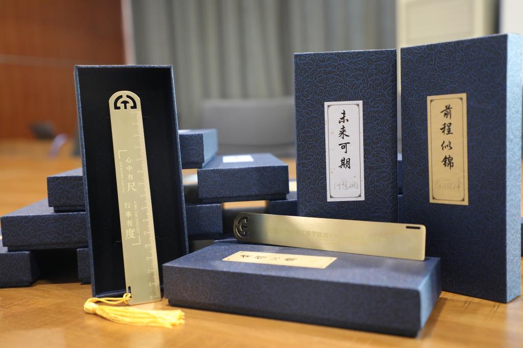 同时,本科生党支部还为毕业生党员每人定制一把集书签和度量功能于一身的黄铜尺,正面刻字“心中有尺行事有度”,背面刻以学院名称和毕业生党员姓名,盒面书写“前程似锦未来可期”,引导党员坚守纪律规矩,勇于砥砺前行。