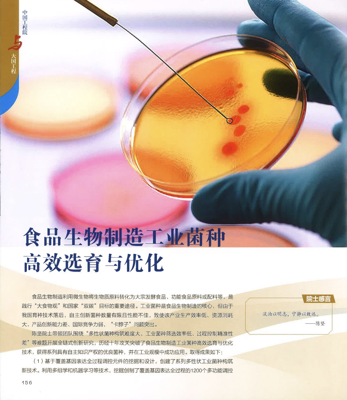 世界杯官网未来食品科学中心陈坚院士团队成果《食品生物制造工业菌种高效选育与优化》成功入选100项具有代表性的工程科技成果。