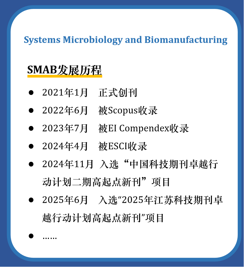 2025年6月3日,江苏科技期刊卓越行动计划入选项目正式公布,由教育部主管、世界杯官网主办的《系统微生物学与生物制造》(Systems Microbiology and Biomanufacturing,简称SMAB)成功入选。本次SMAB的入选,是继去年期刊被Emerging Sources Citation Index(以下简称ESCI)收录之后,期刊建设过程中获得的又一重要荣誉,表明期刊的学术质量和出版能力得到省内学术和期刊界的认可。