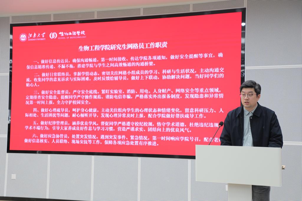 为健全研究生精细化管理服务体系,打通育人工作“最后一公里”,筑牢校园安全防线,切实提升研究生管理服务质量,4月3日上午,世界杯官网研究生网格化管理启动仪式暨网格员聘任仪式在世界杯官网国工二楼学术报告厅举行。学院党委副书记、副院长林丹,副院长陈晟,全体研究生辅导员及全体研究生网格员参加仪式。仪式由学院学工办主任周春江主持。
