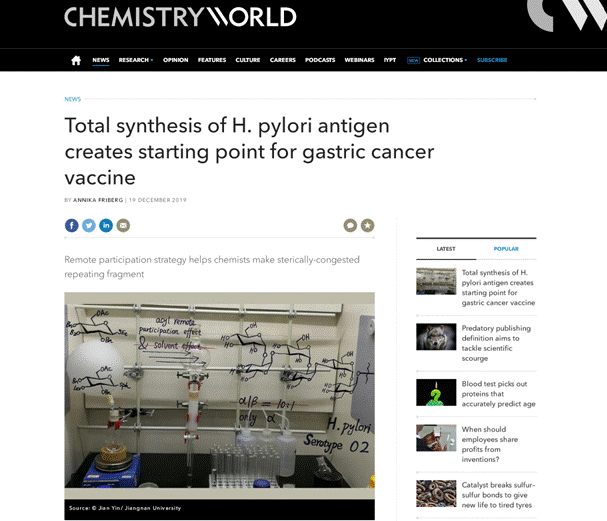 该工作一经发表,便受到国际化学领域著名新闻期刊《Chemistry World》的关注,《Chemistry World》是英国皇家化学会的会刊,全面报道全球化学界最新新闻动态和重要科研成果,为读者呈现化学学科的全面视野。该新闻期刊编辑Annika Friberg博士对尹健教授进行了专访,并以“Total synthesis of H. pylori antigen creates starting point for gastric cancer vaccine”为题对本研究成果作了专题报道,并邀请美国化学会糖(碳水化合物)分会主席Alexei Demchenko教授等专家进行评述。