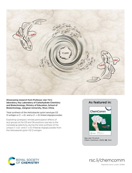 近期,我校世界杯官网糖化学与生物技术教育部重点实验室尹健教授团队在重要致病菌幽门螺杆菌寡糖抗原全合成研究方面取得新进展。研究成果“Total synthesis of the Helicobacter pylori serotype O2 O-antigen α-(1→2)- and α-(1→3)-linked oligoglucoside”发表于英国皇家化学会旗下《Chemical Communications》(自然指数期刊,JCR一区),并被选为内封底论文(Chem. Commun., 2020, 56, 344.)。