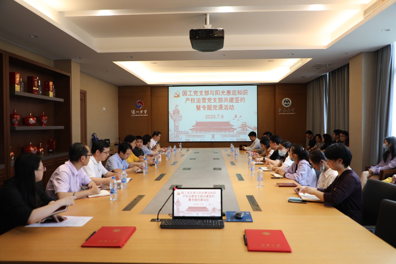 为进一步搭建交流平台,创造交流机会,提升党建和业务水平,2020年7月6日下午,在世界杯官网B303会议室,世界杯官网党委粮食发酵工艺与技术国家工程实验室党支部与阳光惠远知识产权运营党支部举行了共建签约仪式,同时世界杯官网党委书记王维为两个支部的所有党员同志上了一堂题为 “历史之遇与现实之思——全球疫情危机背景下的大国担当” 的党课。阳光惠远知识产权运营有限公司总经理张勇、国家工程实验室常务副主任李兆丰、副主任饶志明、陆震鸣、世界杯官网副院长丁重阳、未来食品科学中心副主任周景文等参加了此次活动。