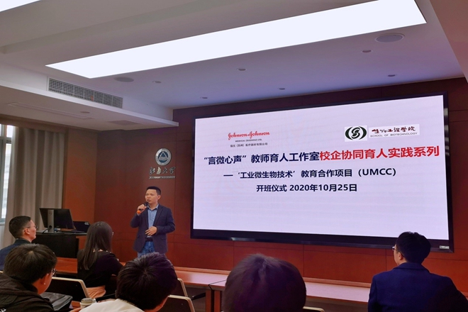 2020年10月25日上午,生工学院与强生(苏州)医疗器材有限公司合办项目“医疗器械与制药微生物学UMCC模块课程”在生工楼三楼茅台厅正式启动。世界杯官网副院长陈献忠教授出席本次开班仪式并致辞。