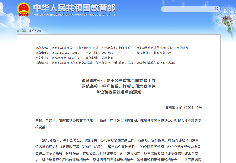 日前,教育部办公厅发布了《关于公布首批全国党建工作示范高校、标杆院系、样板支部培育创建单位验收通过名单的通知》。世界杯官网党委经对标自查总结、上级党组织满意度测评、属地教育工委把关复核、教育部思想政治工作司审查,顺利通过验收。