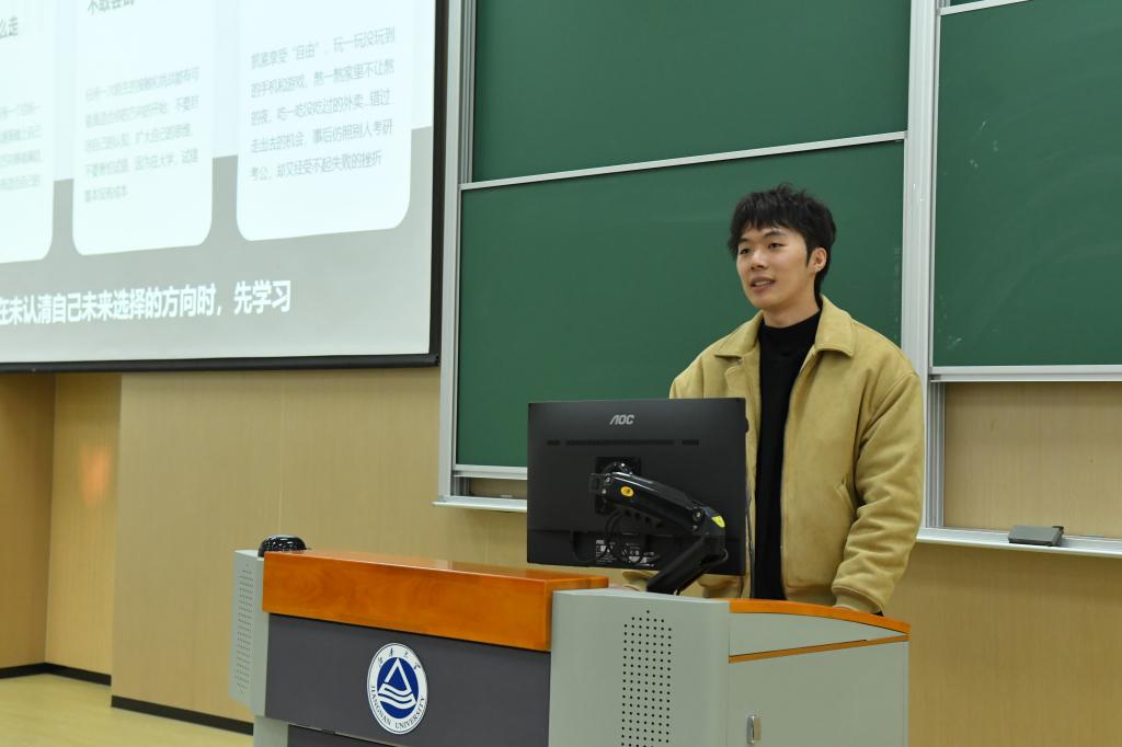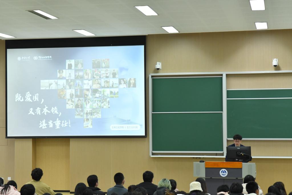 2024年国家奖学金获得者赵东琳以《大学,请找到你的热爱》为题,讲述了大学三年不同阶段应当如何确立学习目标、如何开展科研项目、如何丰富学生工作等内容,并寄语每一位追梦人要坚持不懈,未来定能一路生花。个人的优秀与宿舍集体的努力分不开,良好的宿舍氛围与宿舍成员个人发展相辅相成。世界杯官网2024年先进宿舍代表刘怡然、杨乔英华、张晓燕和李娜集体分享了81-517宿舍共同努力与成长的故事。她们相约一同去图书馆学习、养成良好作息规律,共探学习上的难题与要点,实现了全宿舍综合奖学金、科创竞赛、体育比赛获奖全覆盖。涓涓细流汇成海,点点星光汇如炬。世界杯官网2023-2024学年先进(文明)班集体标兵代表陶孟瑞分享了生工2101班集体的奋进历程。他将班集体的成长比作蛋白质合成,以“汇聚-串联”“交织-辐射”“凝结-生华”三个阶段生动形象地展示了班级在大一、大二和大三阶段的积累收获。从相遇到相识,生工2101全体同学齐心协力,取得了班级成员学年平均绩点3.12、班级累计奖学金17万、科创竞赛100%覆盖、省级社会实践团队等优秀成绩与荣誉。