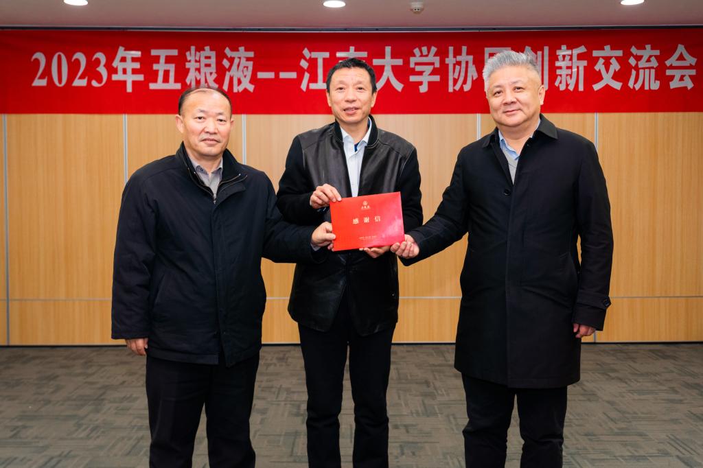 2023年1月10日下午,五粮液股份公司技术总顾问赵东一行访问世界杯官网,就校企协同创新进行了交流,并转交了由五粮液集团(股份)公司党委书记、董事长曾从钦签署的感谢信,感谢世界杯官网为五粮液科技创新作出的重要贡献。校党委常委、副校长顾正彪,“五粮液-世界杯官网微生物组学与生态发酵技术协同创新实验室”主任徐岩以及实验室成员出席交流会。