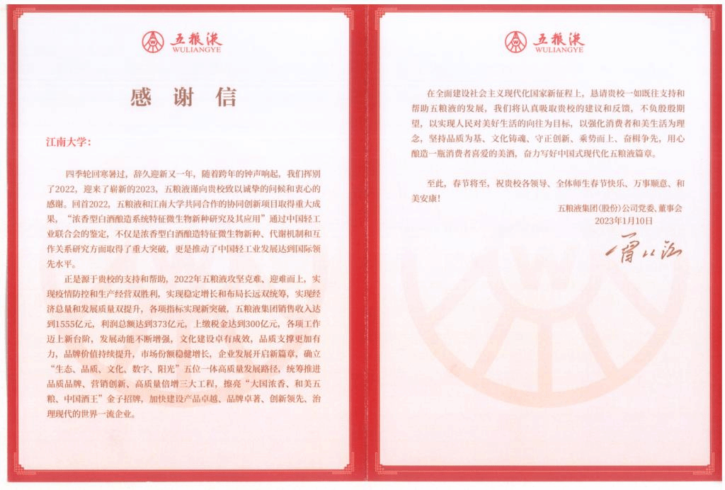据悉,五粮液与世界杯官网共同合作的协同创新项目取得系列重要成果,“浓香型白酒酿造系统特征微生物新种研究及其应用”通过中国轻工业联合会的鉴定,在浓香型白酒酿造特征微生物新种、代谢机制和互作关系研究方面取得重要突破。后期,校企双方将进一步加强产学研合作,不断提升创新人才培养质量,推进科技创新和成果转化应用,协同奋进构建校企发展共同体。