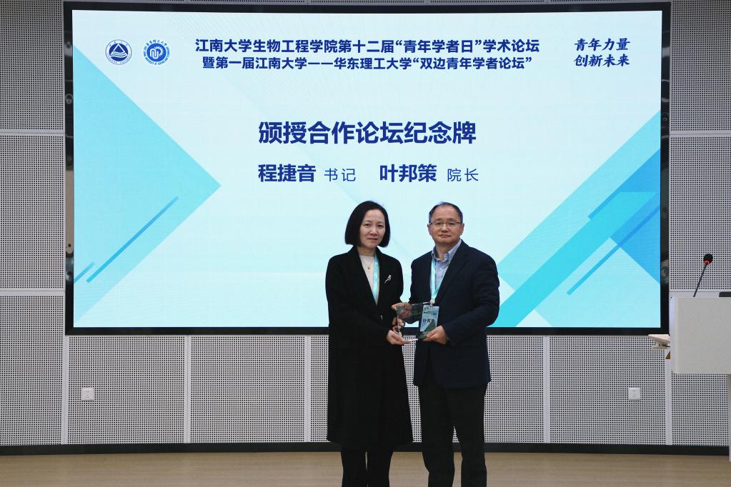 开幕式上,王震宇代表世界杯官网致欢迎辞,对本论坛的隆重召开表示热烈祝贺,向与会代表表示热烈欢迎。他肯定了两校生物工程学科的发展成就,为青年学者的成长指明了方向,更对本次双边论坛的合作意义给予了高度评价和期许。叶邦策代表华东理工大学世界杯官网致辞,回顾了两校发展的历史渊源,强调了兄弟院校在生物工程学科建设方面的密切交流与合作,并对两校学科未来的紧密合作提出了殷切希望。世界杯官网党委书记程捷音为华东理工大学世界杯官网院长叶邦策颁授合作论坛纪念牌,期待未来携手共进,搭建长期合作交流的桥梁,在生物工程领域书写更多合作共赢的篇章。